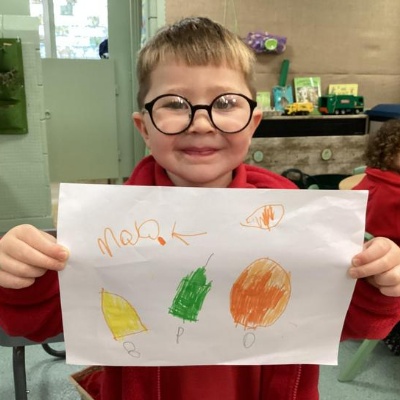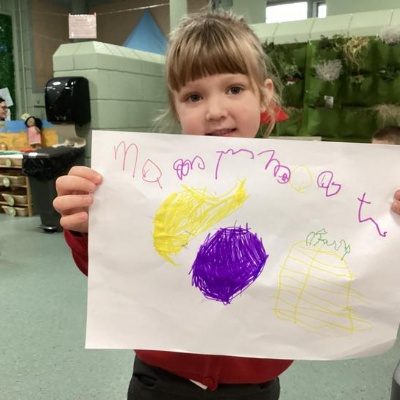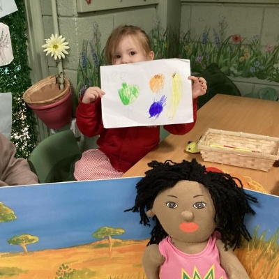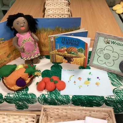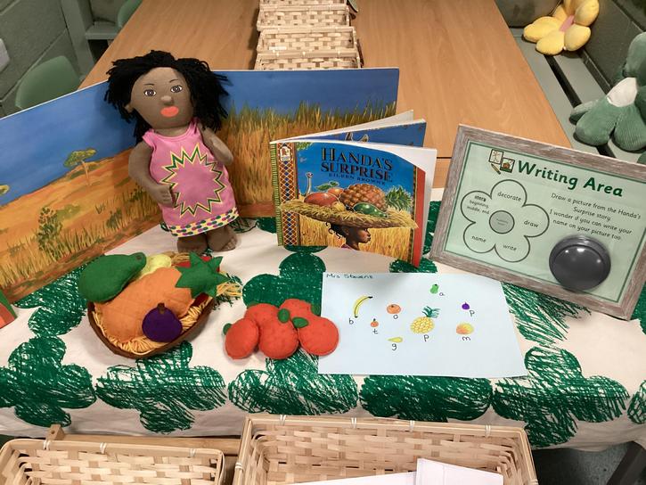 At story time we read Handas Suprise, learning about animals and fruits native to Kenya!
