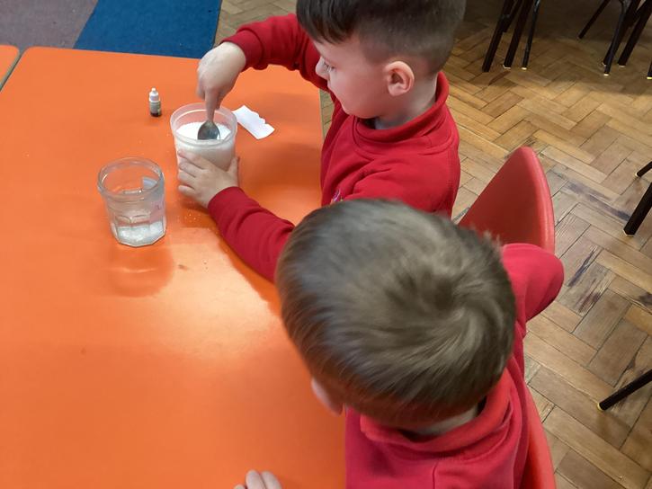 First we added Epsom salts to the glass jar. We then added a couple of drops of food colouring. We then added 1/2 cup of very hot tap water to the jar and stirred for one minute. We discussed that there maybe some salts left in the jar that had not dissolved because the solution was saturated. We then the put the jars in the fridge to cool to allow the crystals to form.
