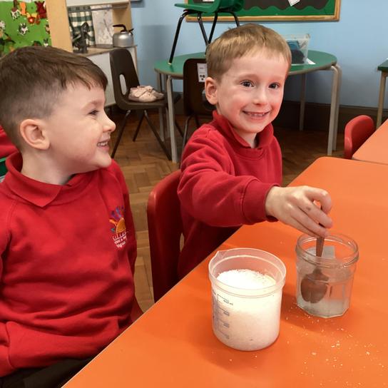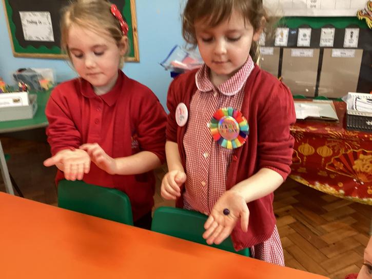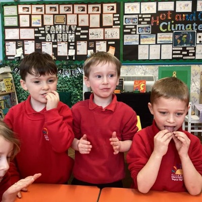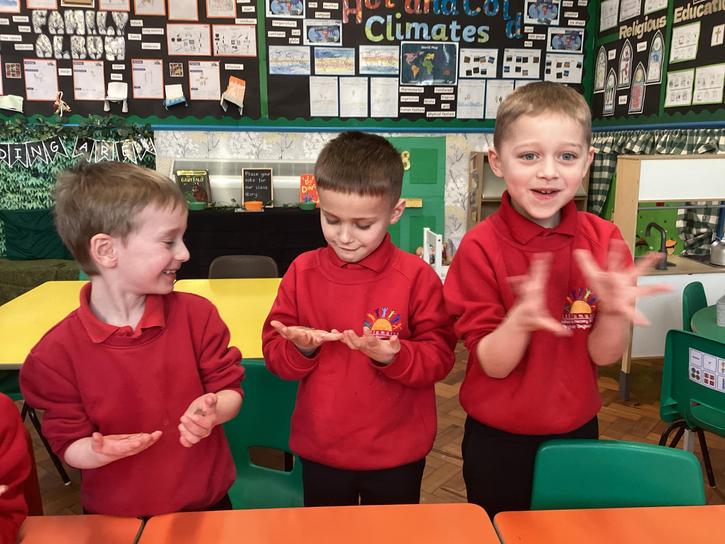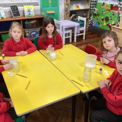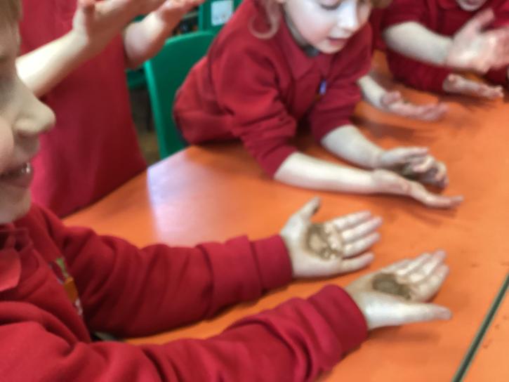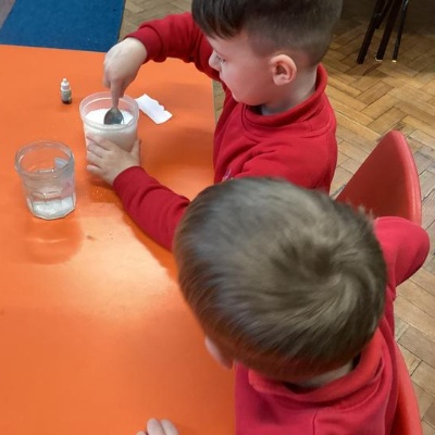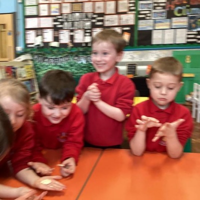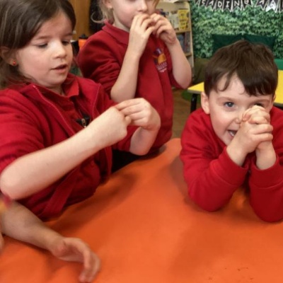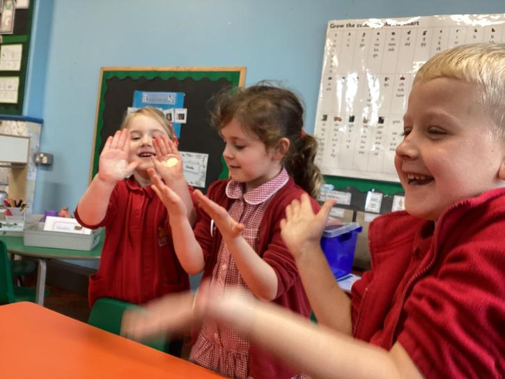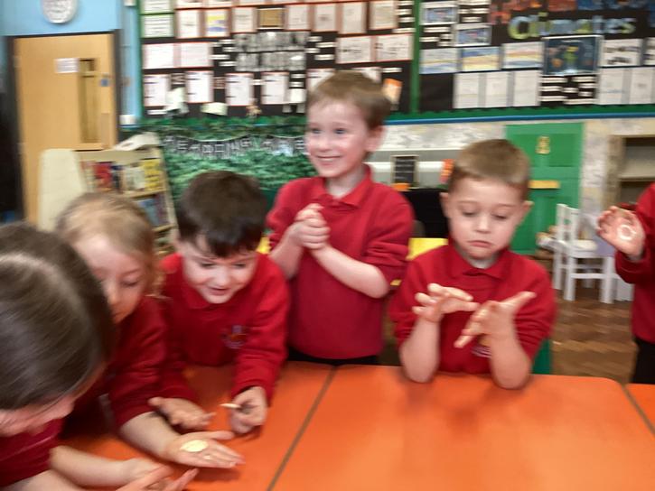 This week we looked at different states of matter, solid, liquid and gas. We then looked at changing the state of matter by melting. We discussed making sure that it was a fair test and also made predictions of which solid would melt the quickest. We talked about how the heat was coming from our own body temperature - when then investigated if we increased our body temperature by jumping around would the chocolate melt quicker. When we finished we managed to get rid of the melted chocolate by eating it!!!