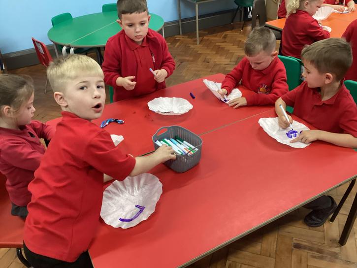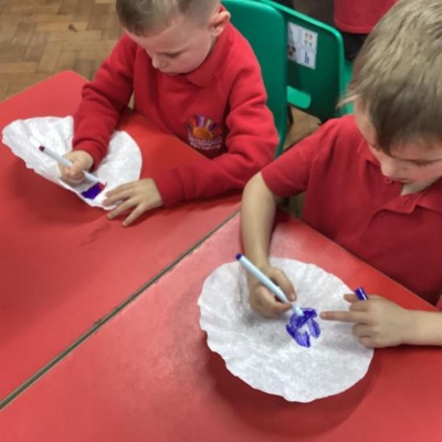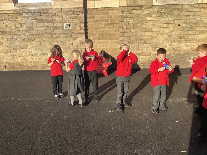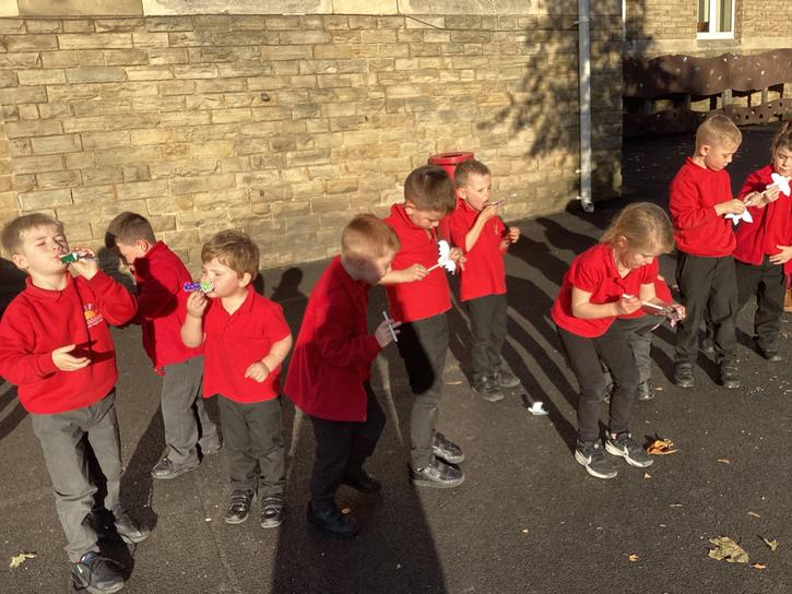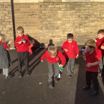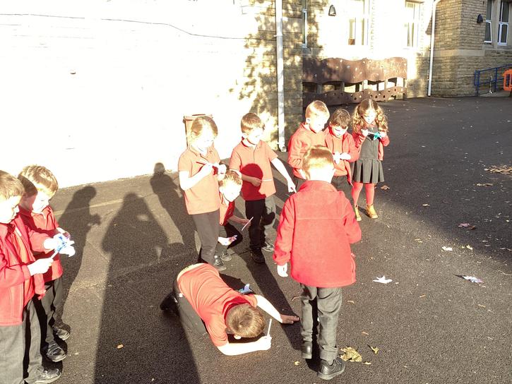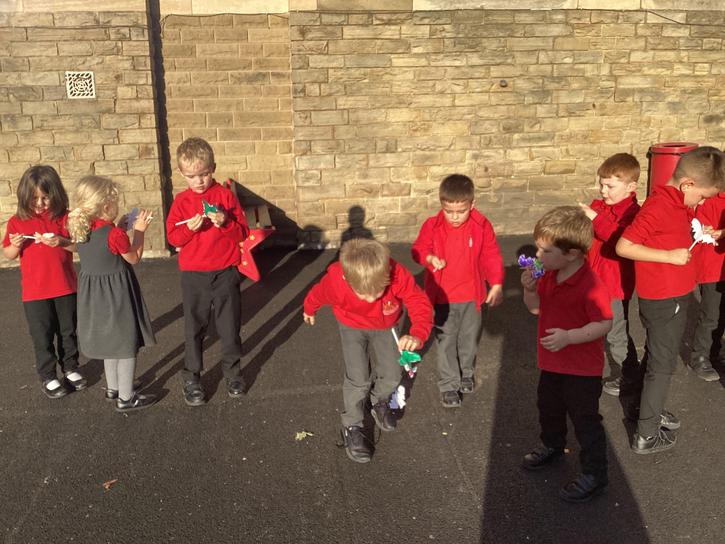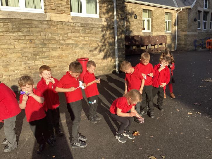 We decorated a template and then cut it out.  We then carefully attached the end of a plastic pipette to the back on the bat.  We inserted a straw into the bat and then blew hard.  We discussed about the pressure from the air blown for our mouths pushed onto the bats and forced them off the end of the straw and flying around.