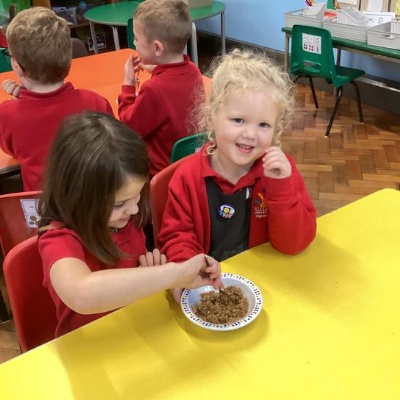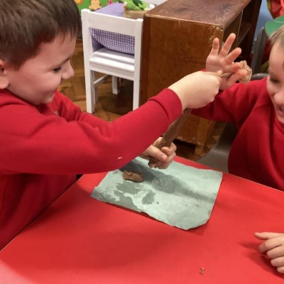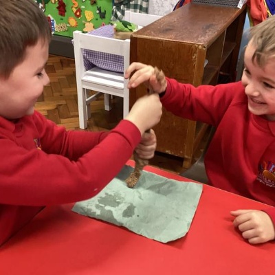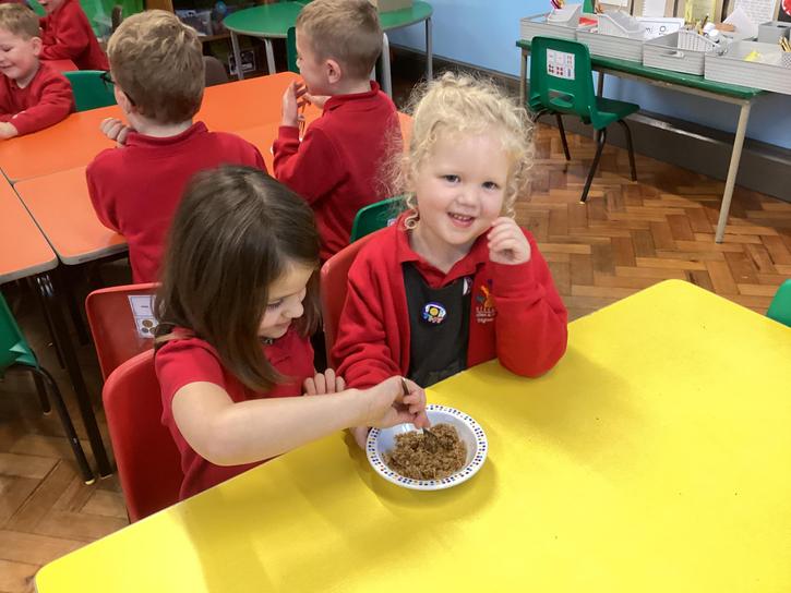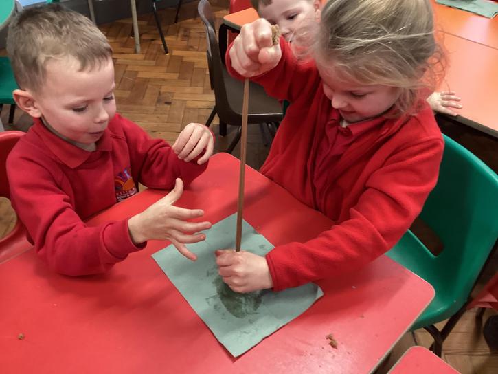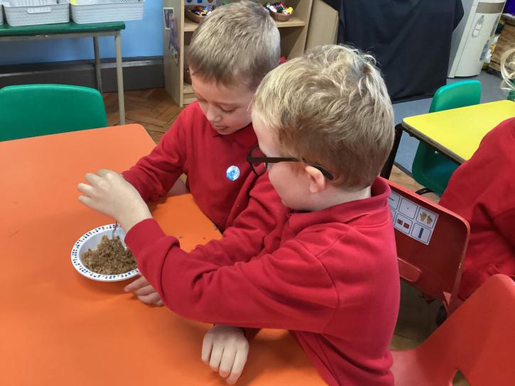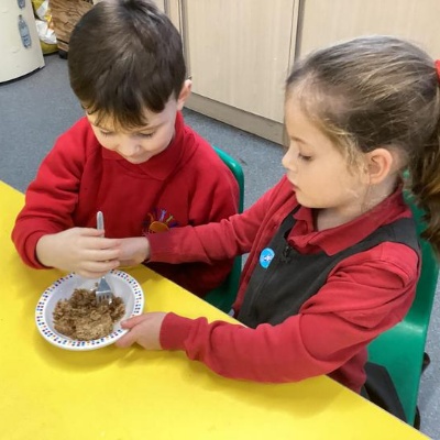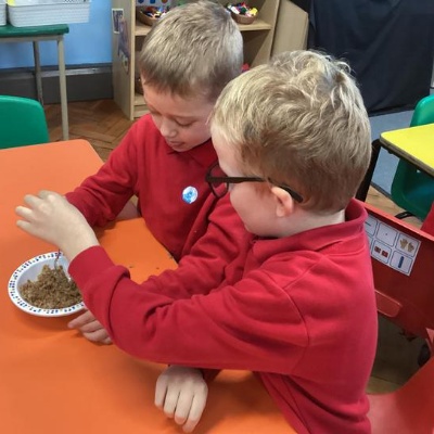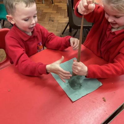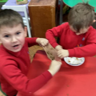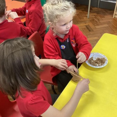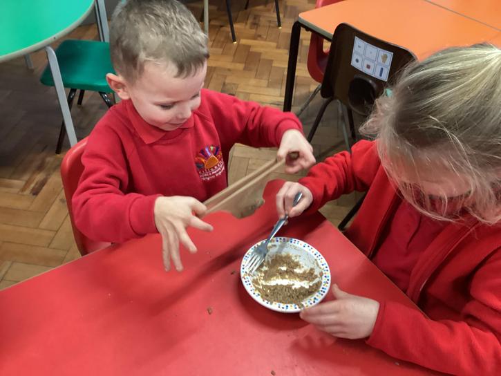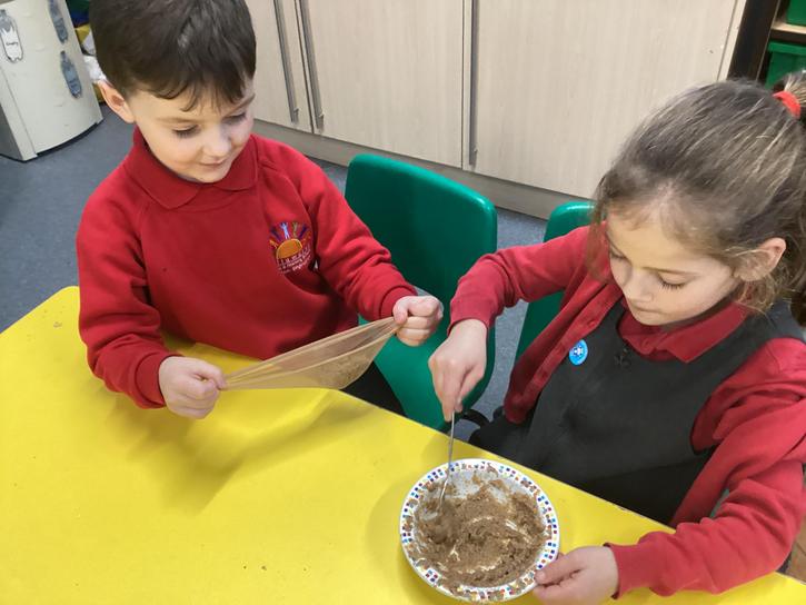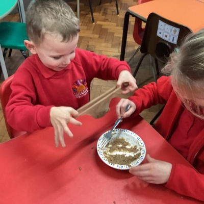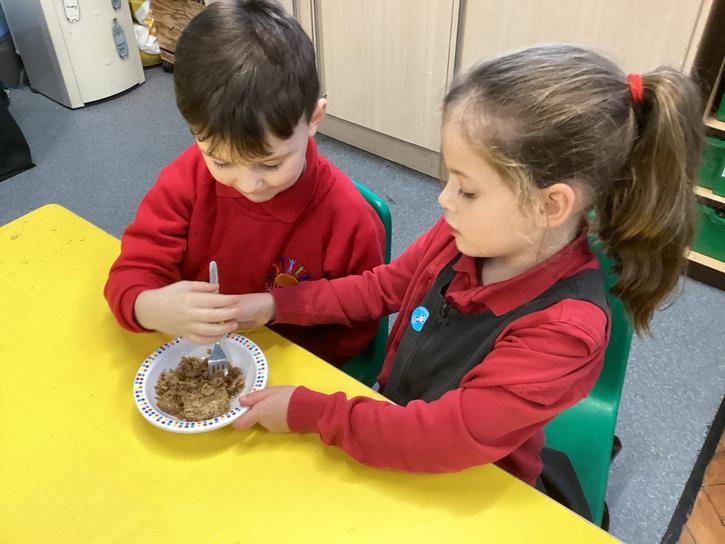 We mashed some Weetabix in a cup and added saliva (water) to break down the food.   We then talked about the food moving down the oesophagus into the stomach.  We mixed in the enzymes (cola) in our stomach to 'digest' it further. We then spooned the mixture into the intestines (tights) and squeezed it through to the end of the intestines and then let nature take it’s course!!!!