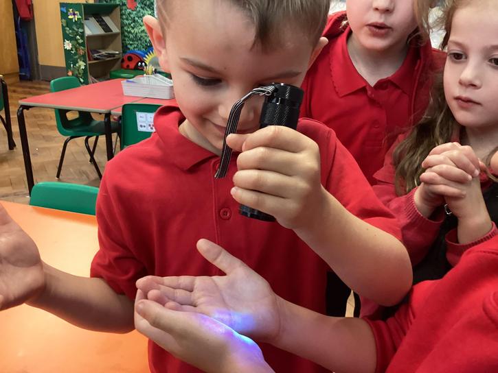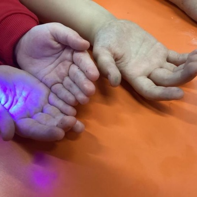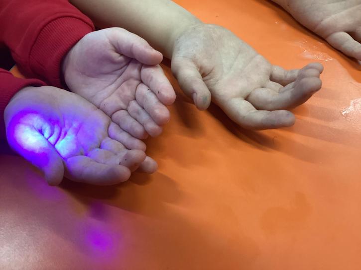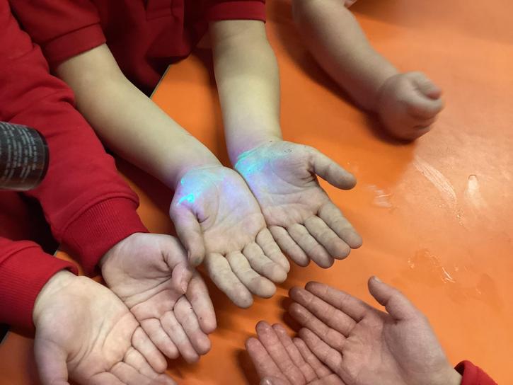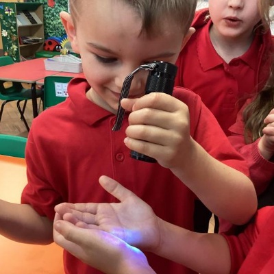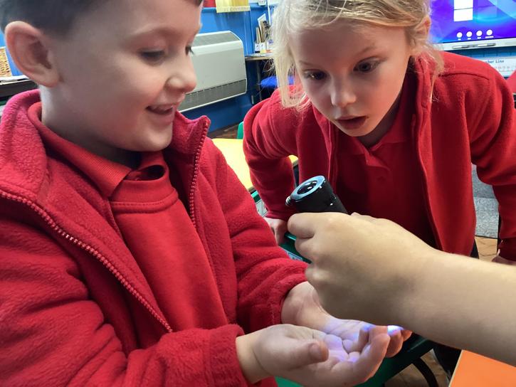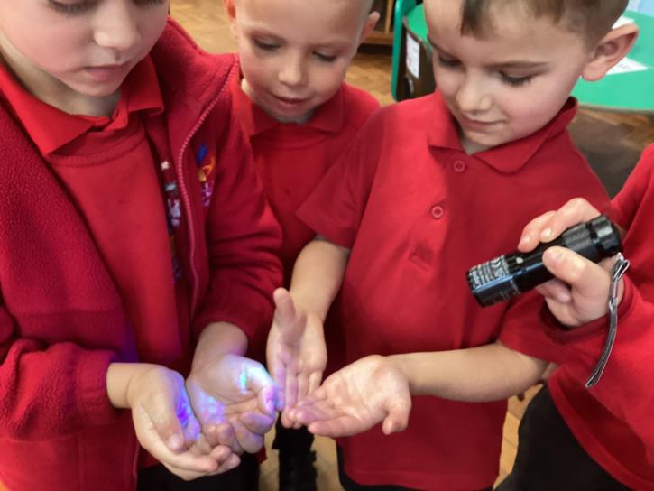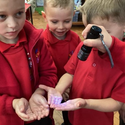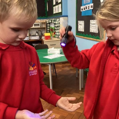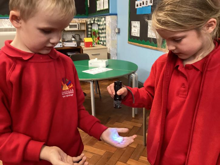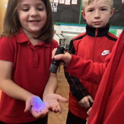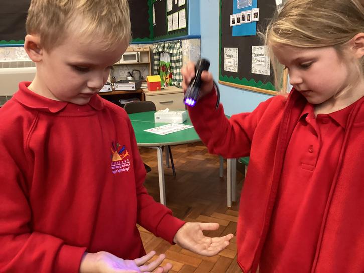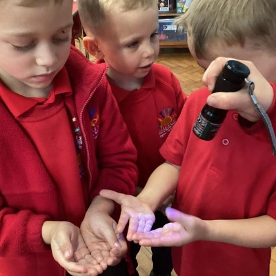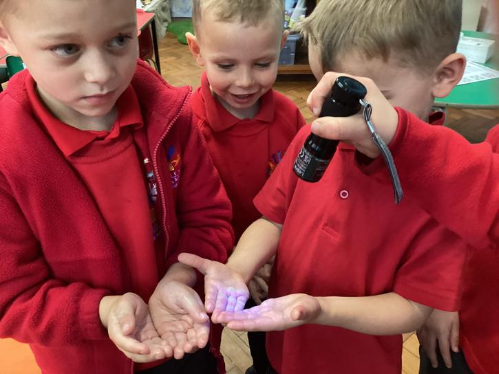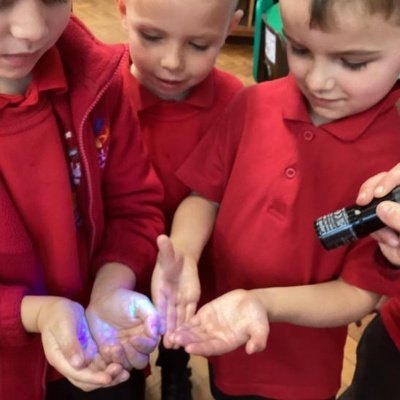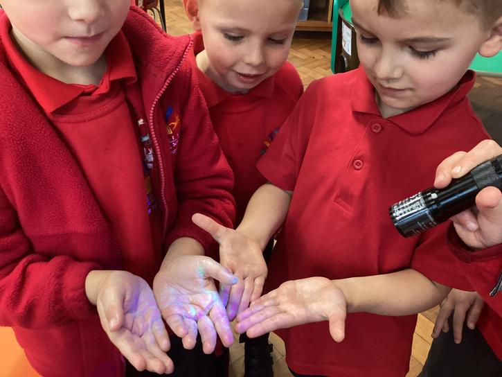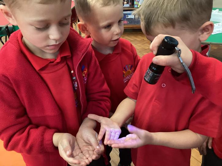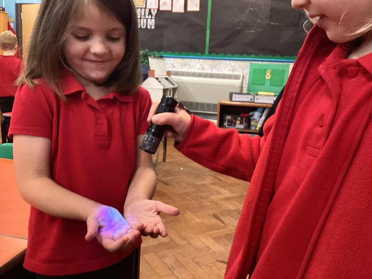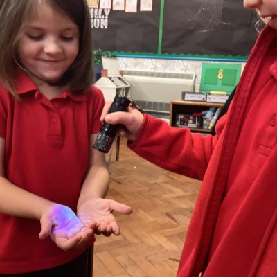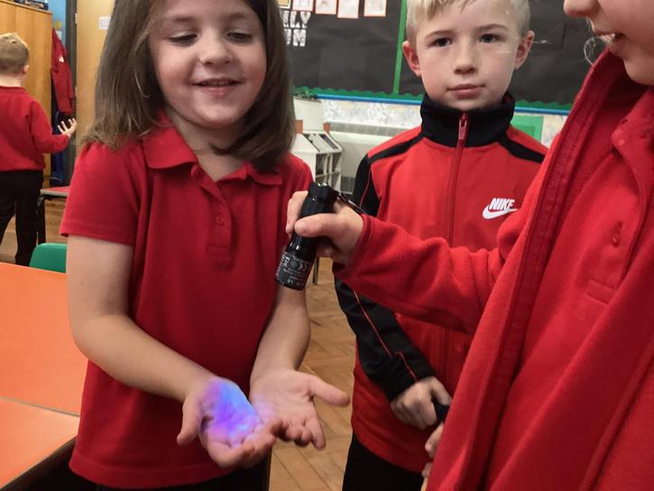 Our first week of science club we planned and carried out an investigation all about germs.  First of all we moved around the classroom and touched as many surfaces as we possibly could.  We then used a special solution that would glow using an Ultra Violet torch if there were germs present.  After looking at our hands covered in germs we then washed them thoroughly using soap and water and compared the final results.