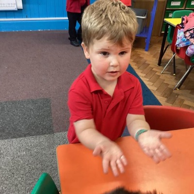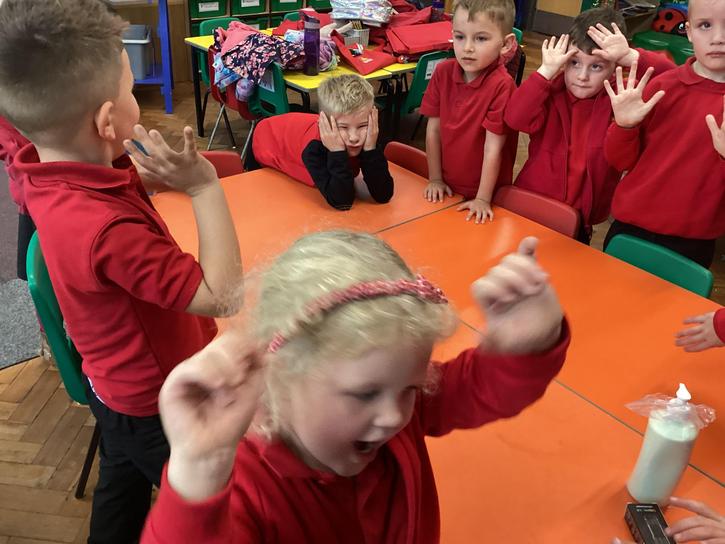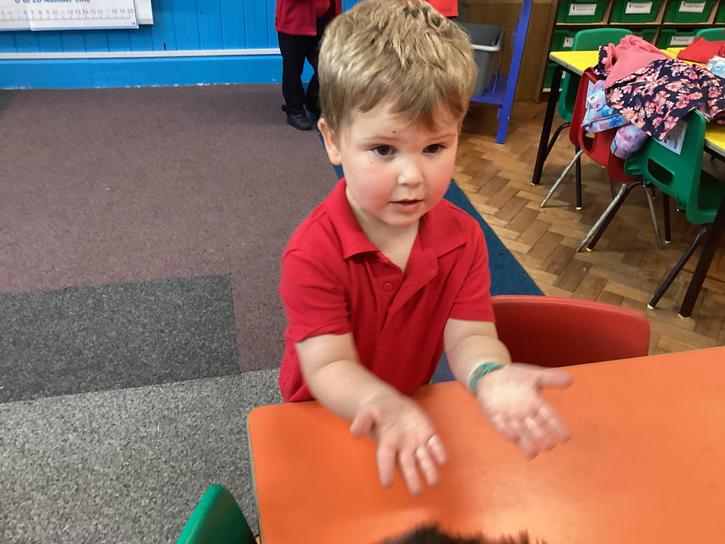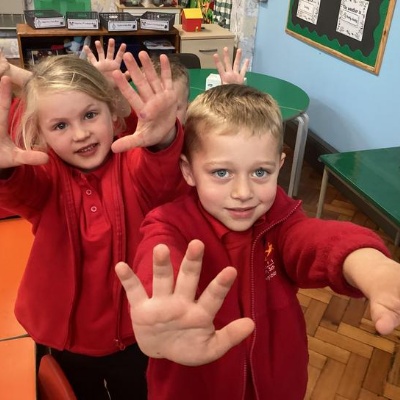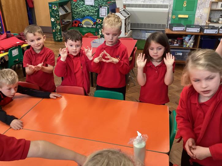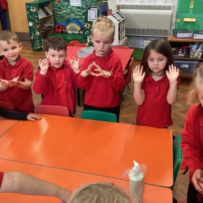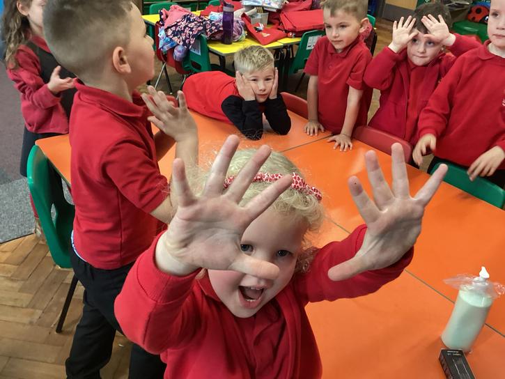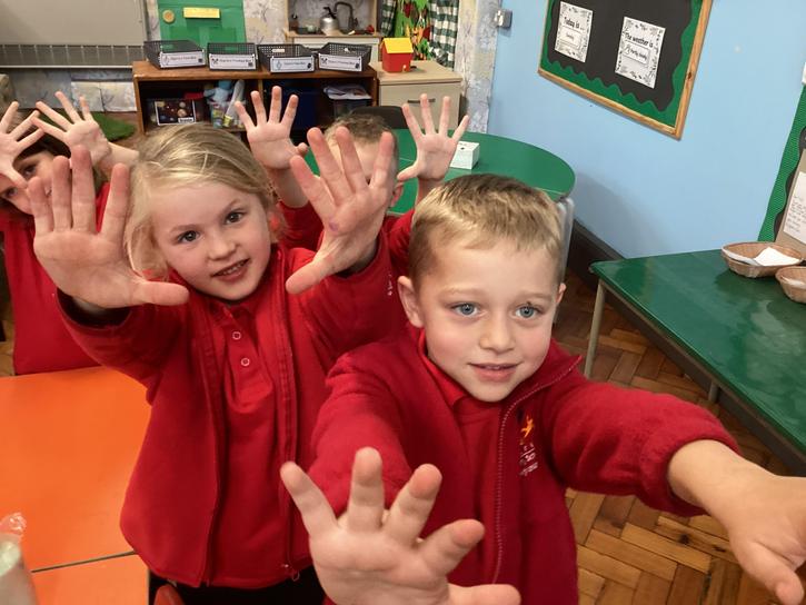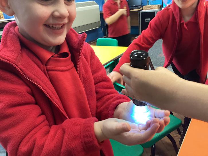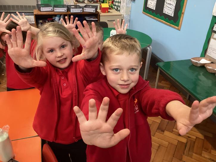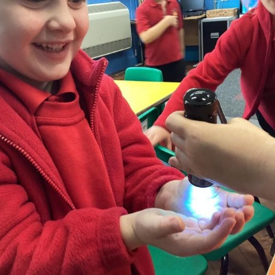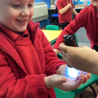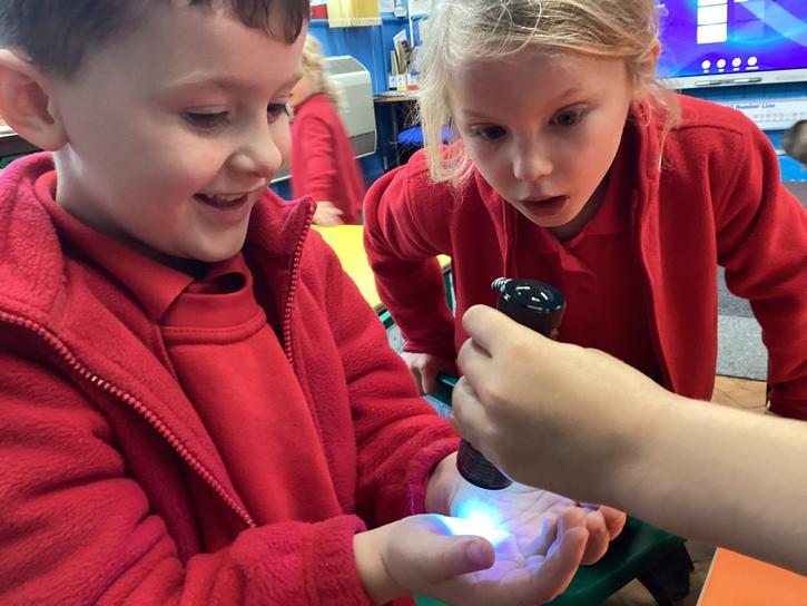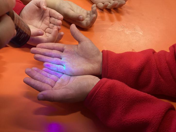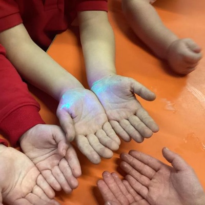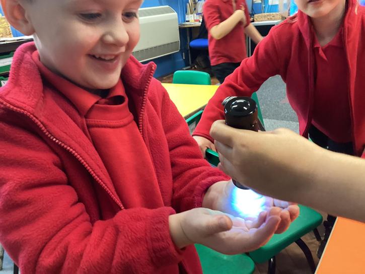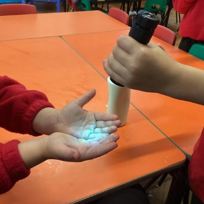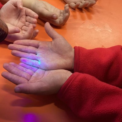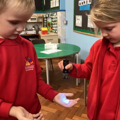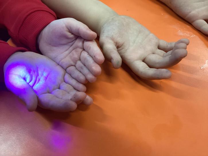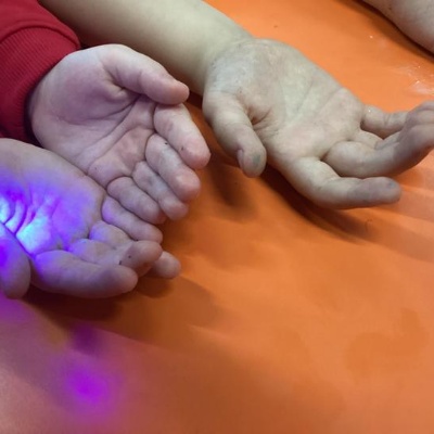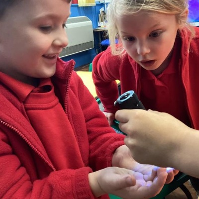 Our first week of science club we planned and carried out an investigation all about germs.  First of all we moved around the classroom and touched as many surfaces as we possibly could.  We then used a special solution that would glow using an Ultra Violet torch if there were germs present.  After looking at our hands covered in germs we then washed them thoroughly using soap and water and compared the final results.
