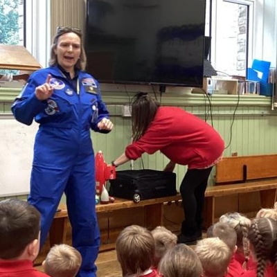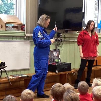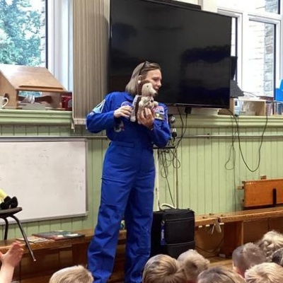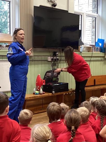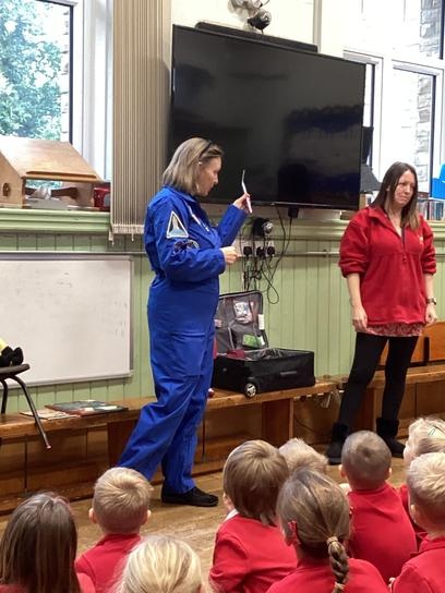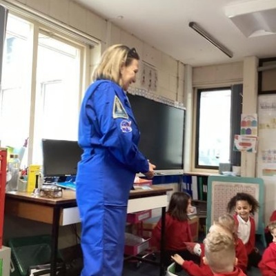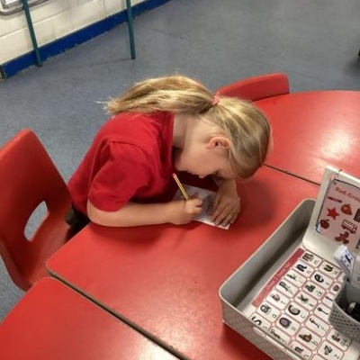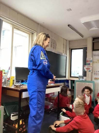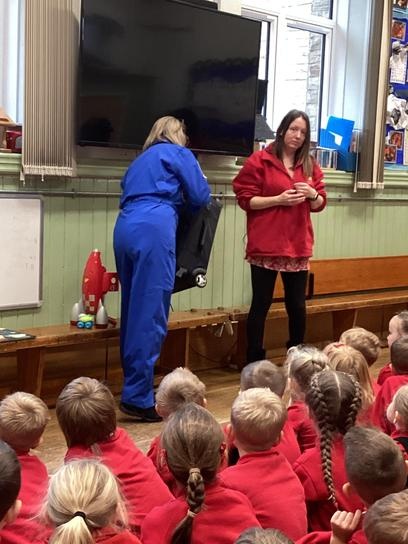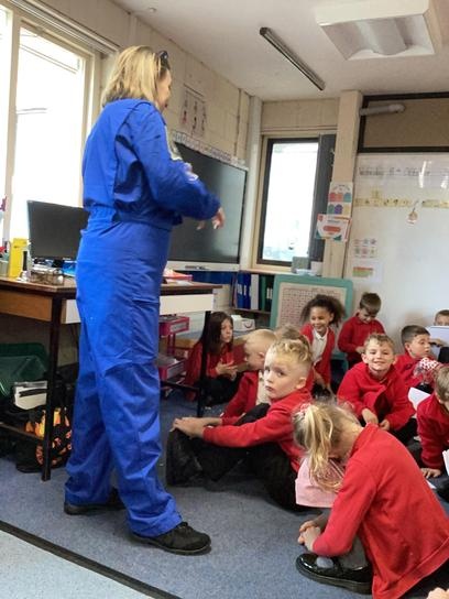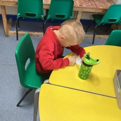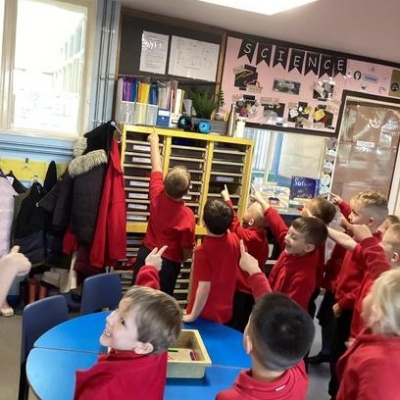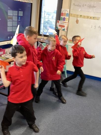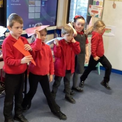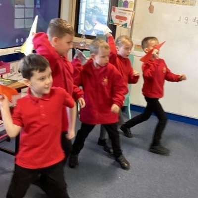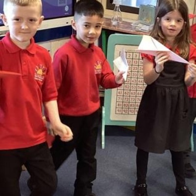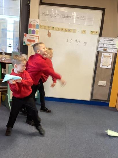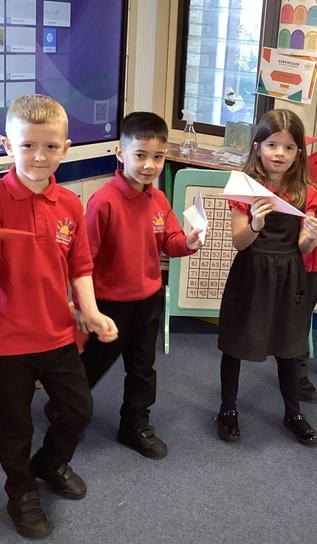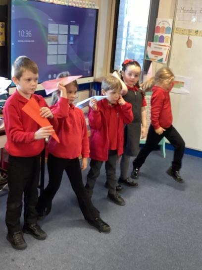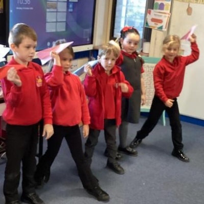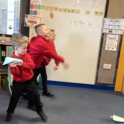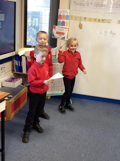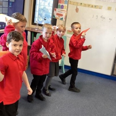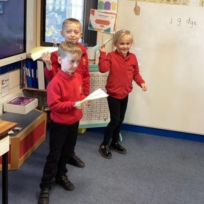 In English, we listened to the story 'The Visitor'. Emil sent us a message using a paper aeroplane. We had to find it in the classroom. We read the letter and we decided to send him a reply. The children thought about how to reply. They wrote their message and then we followed some instructions to make our own paper aeroplane. When we had finished we all flew our aeroplanes across the room.